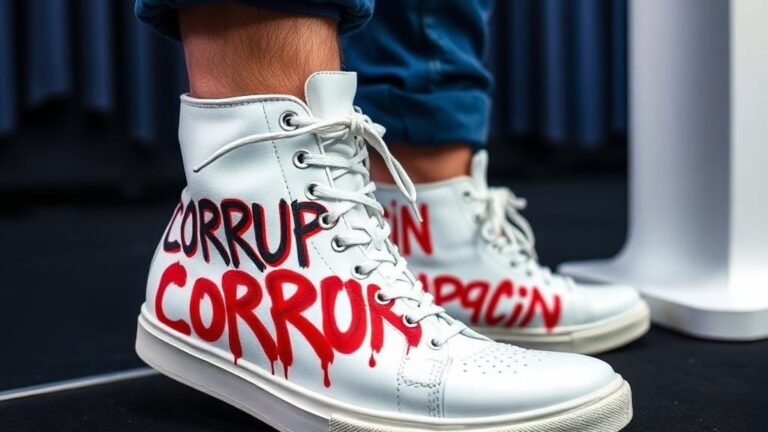 «¿Corrupción? ¿Qué corrupción?», parece decir con su sonrisa. «Miren, amigos, ¡esto sí que es tendencia!». Los ciudadanos, entre confusión y asombro, miran los tenis, mientras las lágrimas por las promesas incumplidas se mezclan con la admiración por el calzado de marca en sus pies.